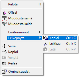 - Valitse asemapiirustuksessa tarvittava geometria ja käytä hiiren kakkospainikkeen takaa löytyvää toimintoa Leikepöytä > Kopioi.