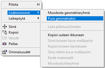- Piirustus voi olla geometriaryhmä, jolloin se täytyy purkaa geometrian peruselementeiksi, pisteiksi ja viivoiksi. Valitse geometriaryhmä, jolloin hiiren kakkospainikkeen takaa löytyy toiminto Lisätoiminnot > Pura geometriaksi.
