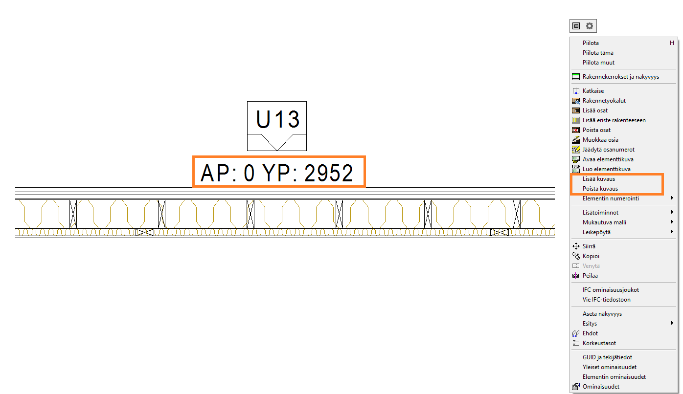 Elementin runkokerroksen ylä- ja alapinnan korkeus pohjakuvanäkymään