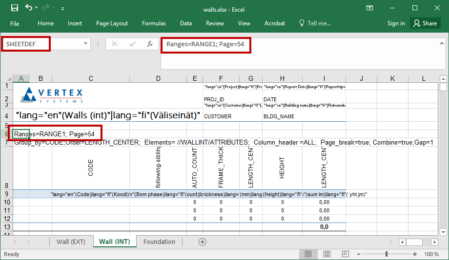 Tiedot haetaan lähdetiedostosta taulukkoon määritetyille tietoalueille. Tietoalueita voi olla useita yhdessä taulukossa. Taulukon tietoalueiden lukumäärä ja nimet asetetaan taulukon määrittelyalueessa, jonka nimen tulee olla SHEETDEF. Määrittelyalueessa ovat käytettävissä seuraavat avainsanat, jotka erotetaan toisistaan puolipisteellä (;):