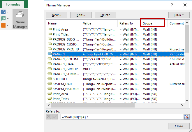Jokaisen solualueen käyttöalue tulee olla ko. taulukko. Varmista oikea käyttöalue Excelin Nimien hallinta -työkalulla. Kun lisäät nimetyn solualueen, valitse sen käyttöalueeksi taulukon nimi Laajuus (Scope) -luettelosta.