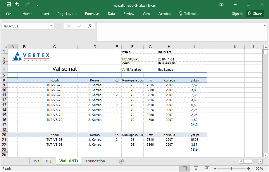 Tietoalueen nimen tulee olla sama kuin taulukon määrittelyalueessa annettu nimi, esimerkiksi RANGE1.