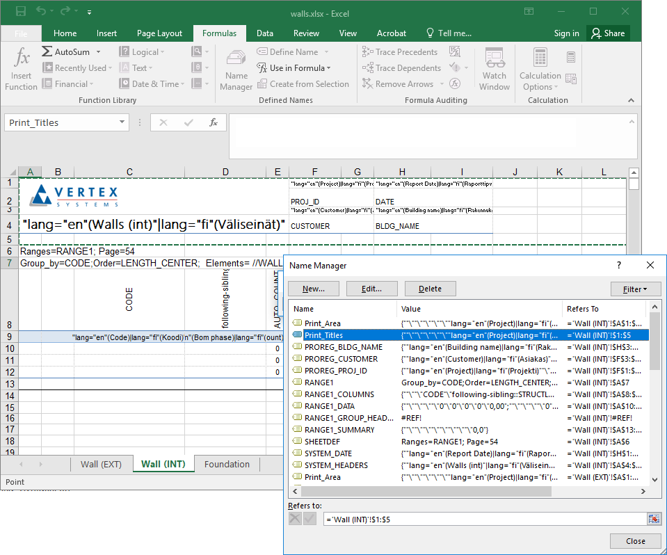 Excel lisää solualueet Print_Area ja Print_Titles automaattisesti Nimien hallinta -luetteloon. Voit myös määrittää alueet Nimien hallinta -toiminnolla kuten muutkin nimetyt solualueet.