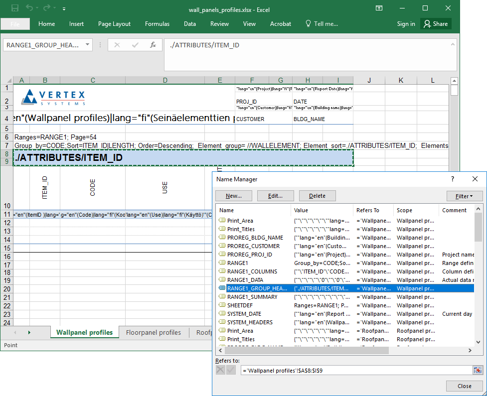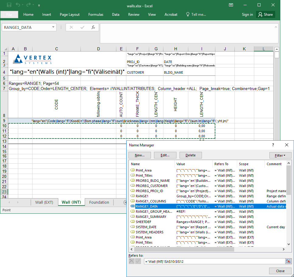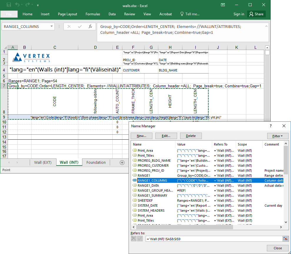 Sarakealueen nimen tulee olla <data_range_name>_COLUMNS, esimerkiksi RANGE1_COLUMNS.