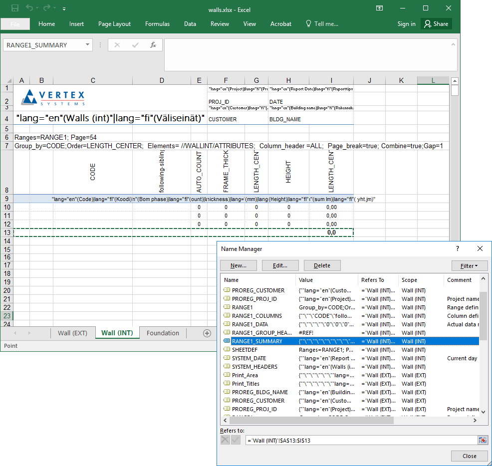 Vakioarvo voidaan määrittää monikieliseksi, jolloin samasta template-taulukosta voidaan tuottaa erikielisiä raportteja. Käyttäjä valitsee minkä kielisen raportin haluaa muodostaa.