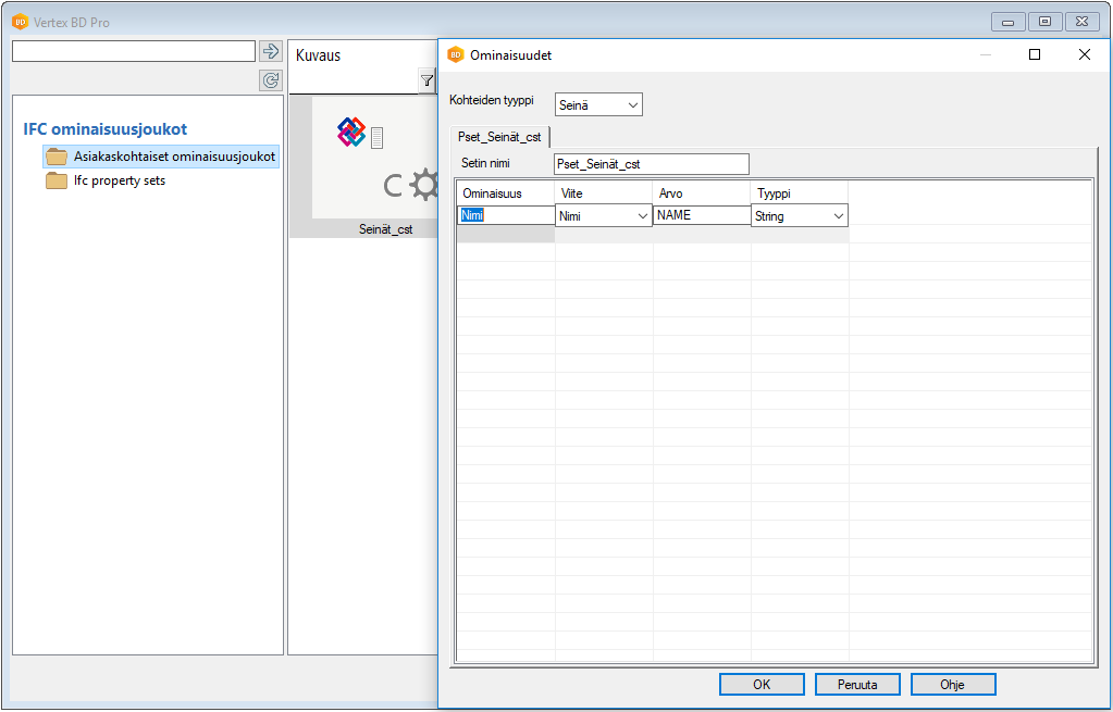 IFC-ominaisuusjoukkovalintoja muokataan samalla tavalla objektityypistä riippumatta.