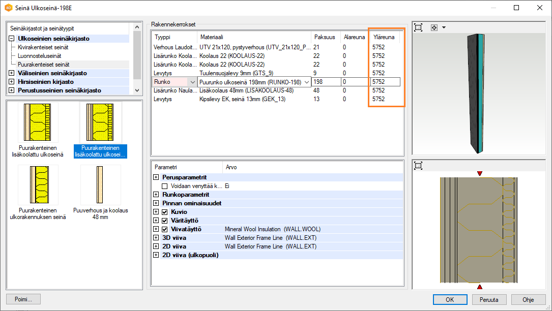 Lisää seinä ensimmäiseen kerrokseen kahden kerroksen korkuisena. Aseta seinän yläreunan korkeus seinän ominaisuuksissa: