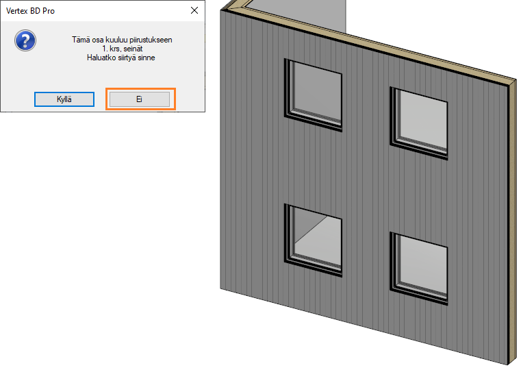 Aktivoi toisen kerroksen kuva-mallipari. Lisää seinään ikkunat toisessa kerroksessa. Koska seinä kuuluu ensimmäiseen kerrokseen, ohjelma kysyy haluatko siirtyä 1. kerroksen kuva-mallipariin. Valitse Ei, ja lisää ikkunat.