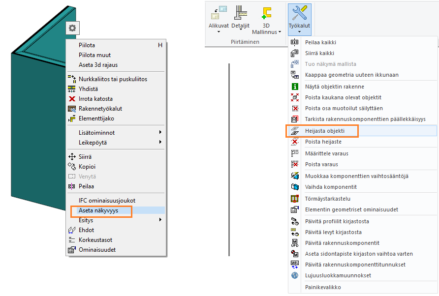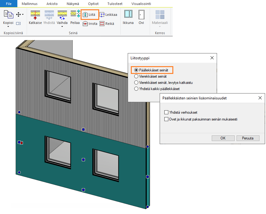 Liitä seinät toisiinsa. Valitse 1. kerroksen seinä ja Seinät-välilehdeltä Liitä. Valitse liitostyyppi Päällekkäiset seinät, osoita liitettävä seinä eli 2. kerroksen seinä, ja valitse Valmis. Lisäominaisuusvalinnat voit jättää tyhjäksi.