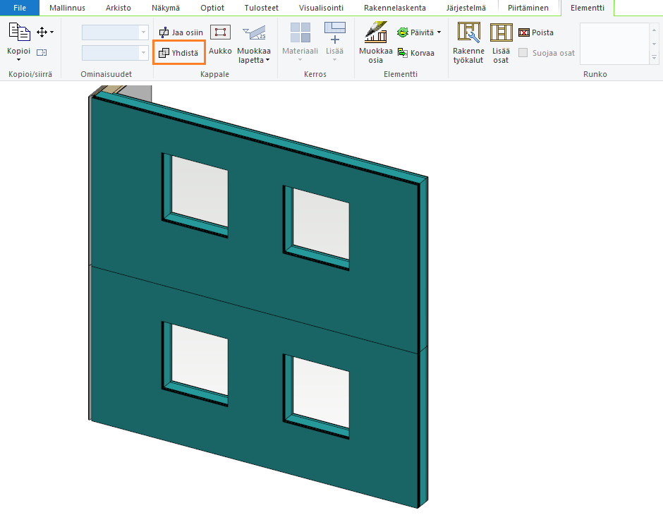 Lisää seinä ja ikkunat arkkitehtimallissa ensimmäiseen kerrokseen. Suunnittele toinen kerros samalla tavalla. Liitä seinät toisiinsa. Muodosta molemmista seinistä elementit ja yhdistä ne. Lisää osat.