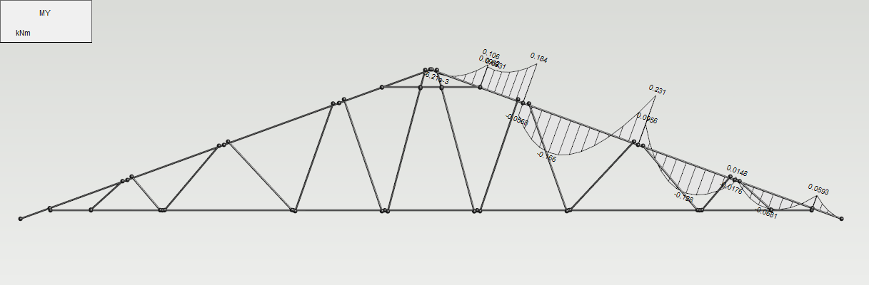 Ratkaise tutkimus uudestaan. Vaihda rasitussuureeksi Taivutusmomentti MY ja tulosten esitystavaksi Kuvaaja. Aseta vielä Piilota profiilit päälle. Näin saat näkyville pelkästään yläpaarteen taivutusmomenttikuvion.