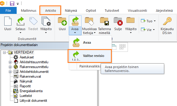 Valitse Arkisto → Projektit → Avaa → Valitse versio.