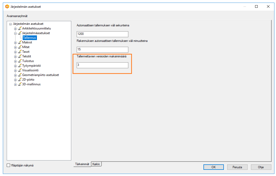 Halutessasi voit lisätä automaattitallennusten määrää.