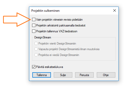 Mikäli haluat säilyttää projektikansiossa vain projektin viimeisimmän version, valitse Vain projektin viimeisin versio pidetään, kun suljet projektin.