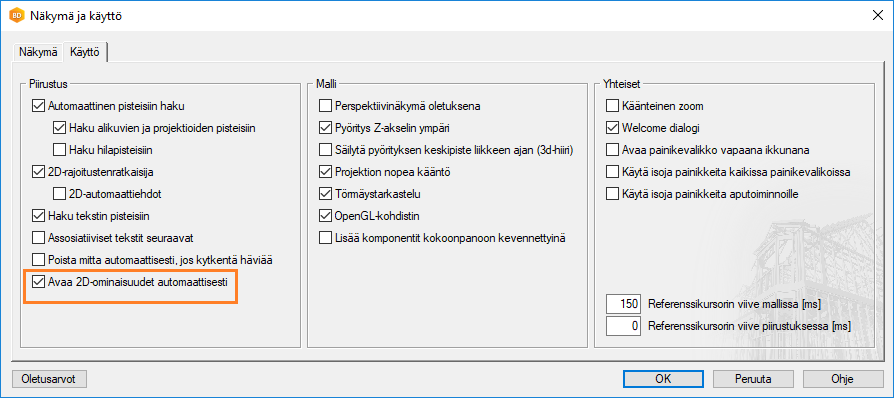 Voit määrittää asetuksissa, että 2D-perusobjektien lisäyksen yhteydessä valintanauhaan avautuu ominaisuusparametrit automaattisesti. Määritä välilehden avautuminen valitsemalla Tiedosto → Asetukset → Piirustukset, mallit → Näkymä.