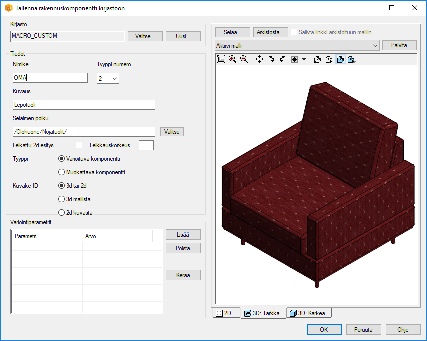Nimike - Nimikettä käytetään materiaalinkeruussa. Nimikkeestä tulee myös mallitiedoston nimi komponenttikirjastoon. Mallitiedosto tallentuu nimellä [nimike].vxm ../custom/complibs/macro_custom -kansioon.