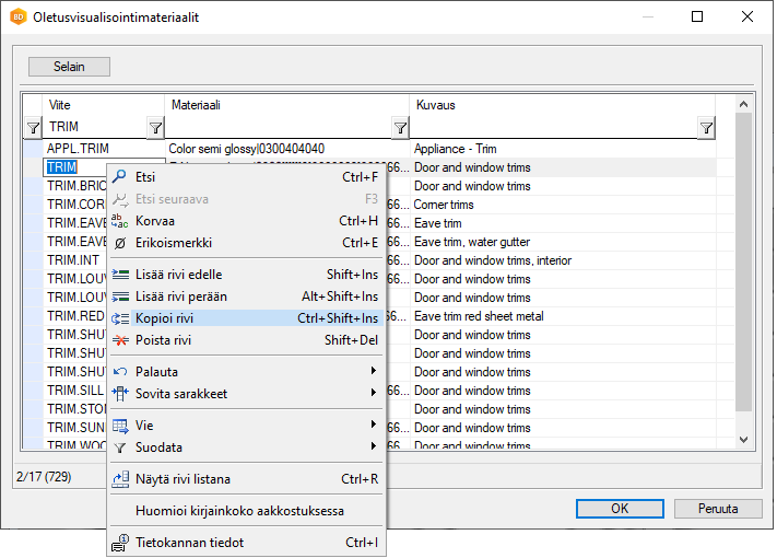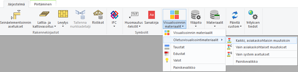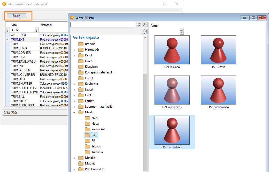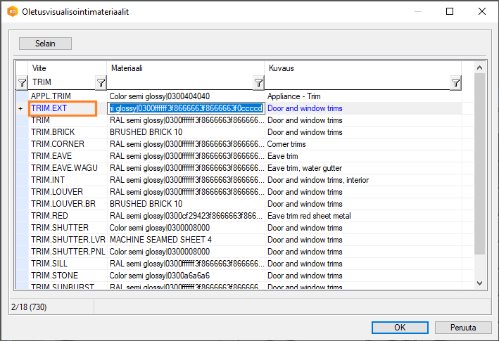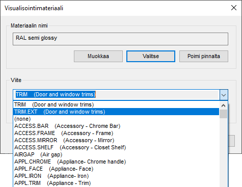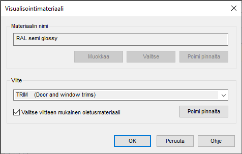 Osan visualisointimateriaali määräytyy osalle asetetun materiaaliviitteen mukaan. Viitteen oletusvisualisointimateriaali taas on asetettu materiaalien linkitystietokannassa (LWMAP). Voit lisätä linkitystietokantaan uuden viitteen, valita viitteelle oletusvisualisointimateriaalin, ja asettaa viitteen haluamallesi osalle.