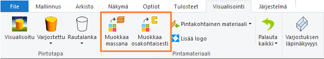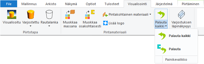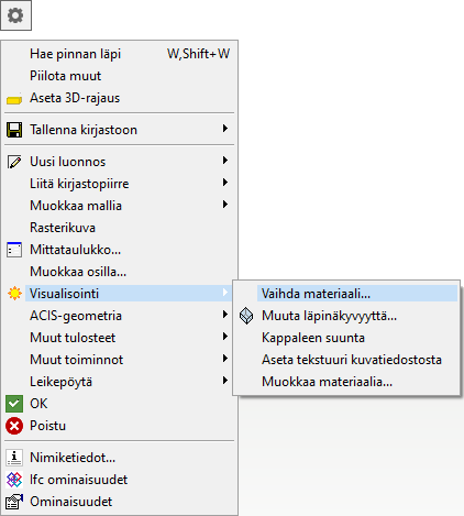 Kun olet lisännyt osan rakennusmalliin, voit vaihtaa viitteen visualisointimateriaalia kyseisessä mallissa. Voit vaihtaa yksittäisen osan visualisointimateriaalia tai kerralla kaikkien niiden osien materiaalia, joilla on sama viite. Viitteen oletusvisualisointimateriaali säilyy ennallaan materiaalien linkitystietokannassa.