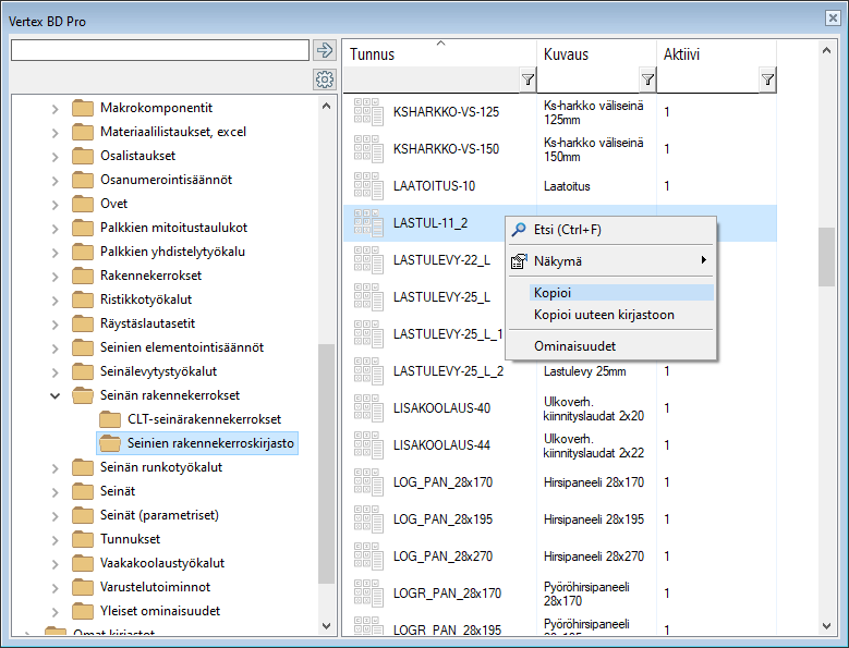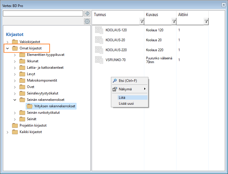 - Jos oma asiakaskohtainen kerroskirjasto on jo olemassa, valitse Kopioi. Valitse kirjasto Omat kirjastot / Seinän rakennekerrokset -kansiosta, avaa tilannekohtainen valikko hiiren oikealla painikkeella, ja valitse Liitä.