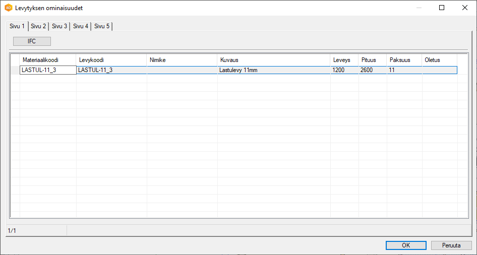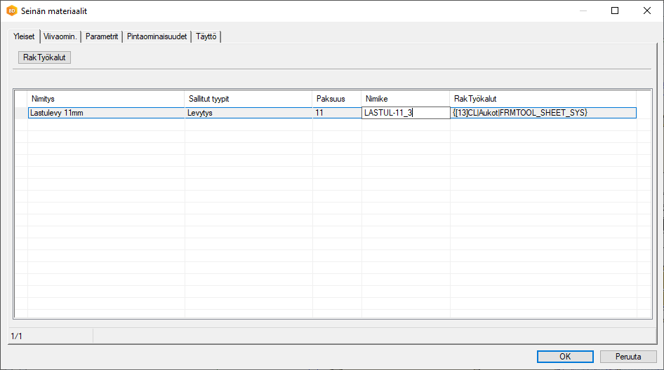 Käytä Materiaalikoodina seinien rakennekerroskirjastossa käyttämääsi nimikettä ja täydennä muiden kenttien arvot levykokoa vastaaviksi.