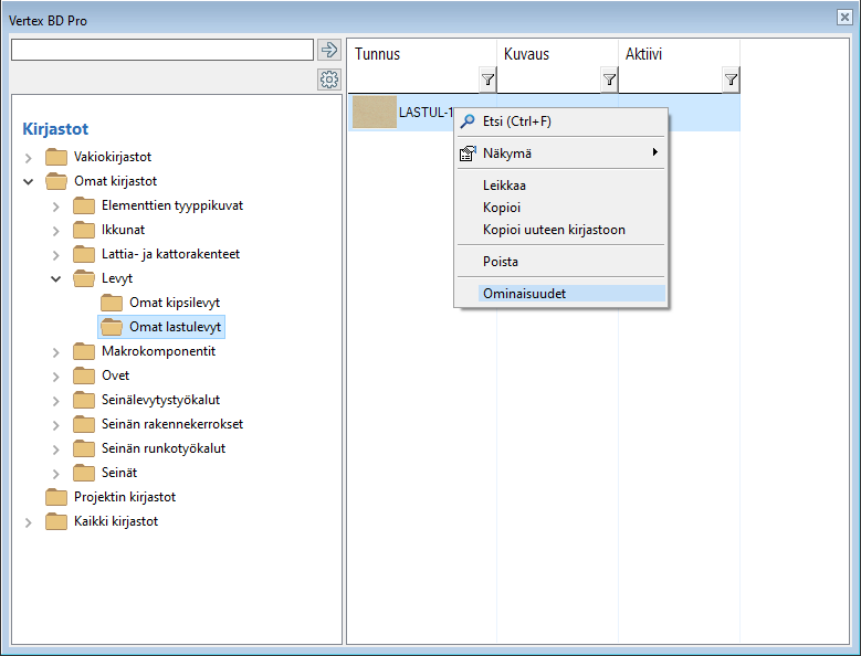 Kaksoisnapsauta kerrosta tai valitse Ominaisuudet hiiren oikealla avautuvasta valikosta. Seinän materiaalit -tietokantanäyttö avautuu.