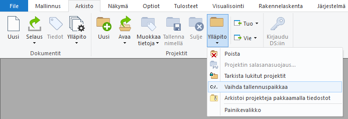 Voit myös siirtää olemassa olevia projekteja uuteen tallennuspaikkaan. Valitse Arkisto | Projektit | Ylläpito > Vaihda tallennuspaikkaa.