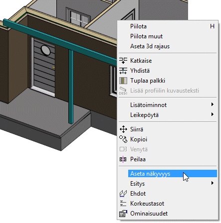 Rakennusosien geometria näytetään oletuksena vain yhdessä kuva-malliparissa: siinä, johon rakennusosa on lisätty tai siirretty. Tarvittaessa voit asettaa osat näkymään myös muissa kuva-mallipareissa. Saat esimerkiksi pilarit, palkit ja savuhormit näkymään sekä arkkitehti- että runkomallissa. Samoin voit asettaa moduliverkon tai leikkausmerkinnät näkyviin haluamiesi kerrosten pohjakuvissa.