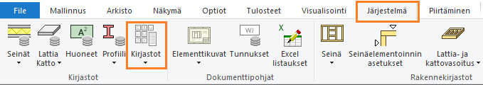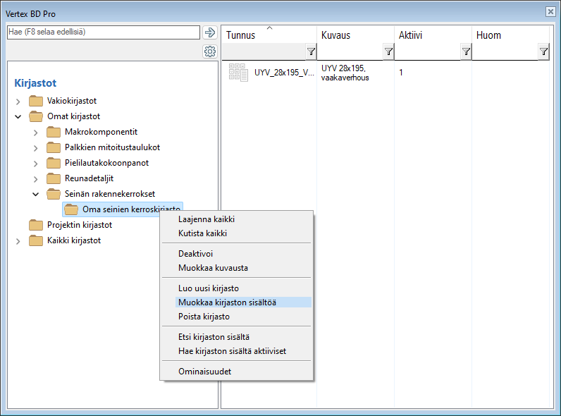 Jos omaa asiakaskohtaista kerroskirjastoa ei vielä ole olemassa, valitse kirjastoselaimessa Vakiokirjastot / Seinien rakennekerrokset / Seinien rakennekerroskirjasto. Valitse jokin kerros oikeanpuoleisessa selainruudussa, ja hiiren oikealla avautuvasta valikosta Kopioi uuteen omaan kirjastoon. Anna kirjaston kuvaus.