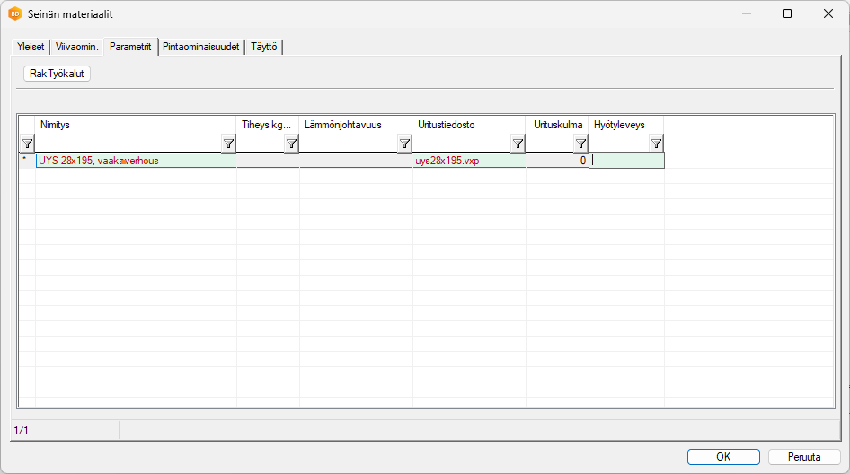 Seinän materiaalit -tietokantanäyttö avautuu.