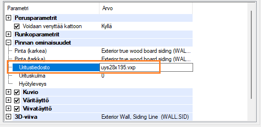 Voit asettaa uritustiedoston verhouskerrokselle seinän ominaisuuksissa.