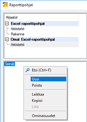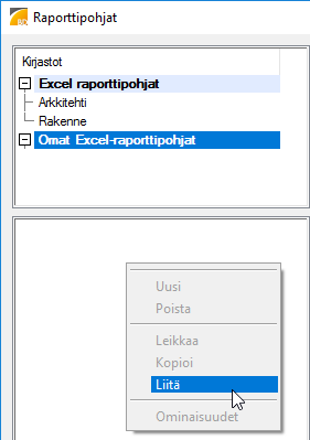 Ohjelmiston vakiotoimitus sisältää valmiita komponenttikirjastoon tallennettuja raporttipohjia. Voit luoda oman raporttipohjakirjaston ja lisätä sinne raporttipohjan kopioimalla valmiin raporttipohjan järjestelmän kirjastosta. Avaa sen jälkeen raporttipohja muokattavaksi. Lisätietoa raporttipohjan muokkaamisesta: Excel-raporttipohjan rakenne.