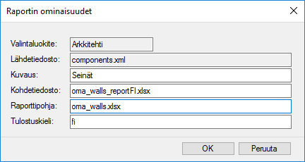 Kohdetiedosto - Projektikansioon tallentuvan lopullisen materiaaliraportin tiedostonimi (*.xlsx). Voit antaa tiedostonimen muodossa kansio/tiedostonimi.xlsx, jolloin tiedosto tallentuu projektin alla olevaan kansioon.