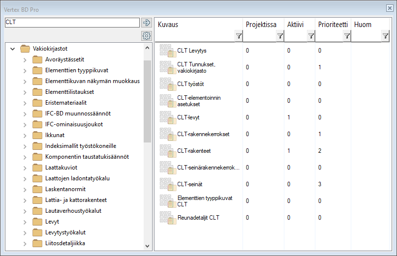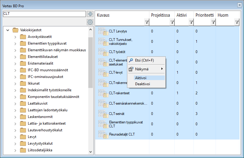 Voit valita rakenteita CLT-kirjastoista, kun asetat kirjastot aktiivisiksi.