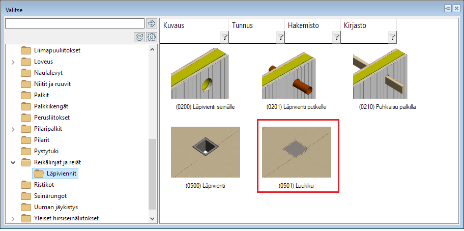 Työkalulla voit lisätä halutun kokoisen luukun elementtiin. Luukku vaikuttaa rungon ja levytyksen generointiin. Käyttäjä voi valita puhkaistaanko läpivienti rakenteen läpi vai vain ylä- tai alapuolelle. Puhkaistun läpiviennin kohdalla lisätään levyn palanen osien generoinnin yhteydessä.