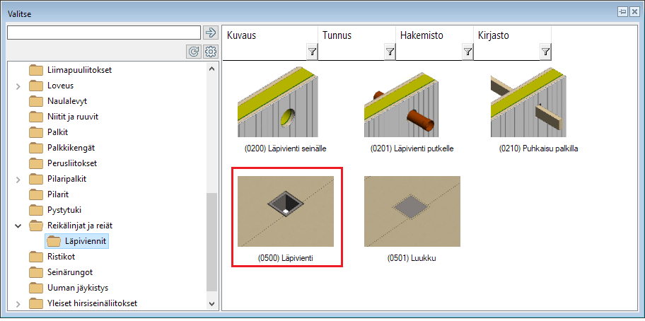 Työkalulla voit lisätä halutun kokoisen läpiviennin elementtiin. Läpivienti vaikuttaa rungon ja levytyksen generointiin. Käyttäjä voi valita puhkaistaanko läpivienti rakenteen läpi vai vain ylä- tai alapuolelle.