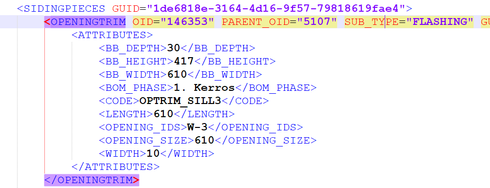 Ikkunoissa, ovissa ja verhouksien välissä käytetyt peltiosat ovat nyt vesipelti-alityyppiä (FLASHING). Päätyyppi pysyy samana (OPENINGTRIM).