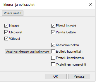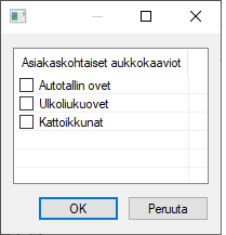 Objektityyppiä käytetään objektipuun järjestämiseen ja esimerkiksi Excel-raporteissa. Jos aukkojen pielien verhouslauta/-listakirjasto on asiakaskohtainen, uusien tyyppien käyttöönotta edellyttää objektityyppien lisäämistä asiakaskohtaiseen kirjastoon.