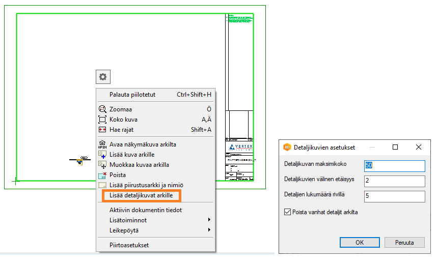 Voit nyt helposti lisätä viitepiirustuksessa käytetyt yksityiskohdat piirustusarkkeihin. Toiminto löytyy piirustusarkin vapaasta tilasta asiayhteysherkässä valikossa. Tämän ominaisuuden avulla voit saada taulukon tiedot nopeasti. Toiminto tekee rutiinityötä puolestasi.