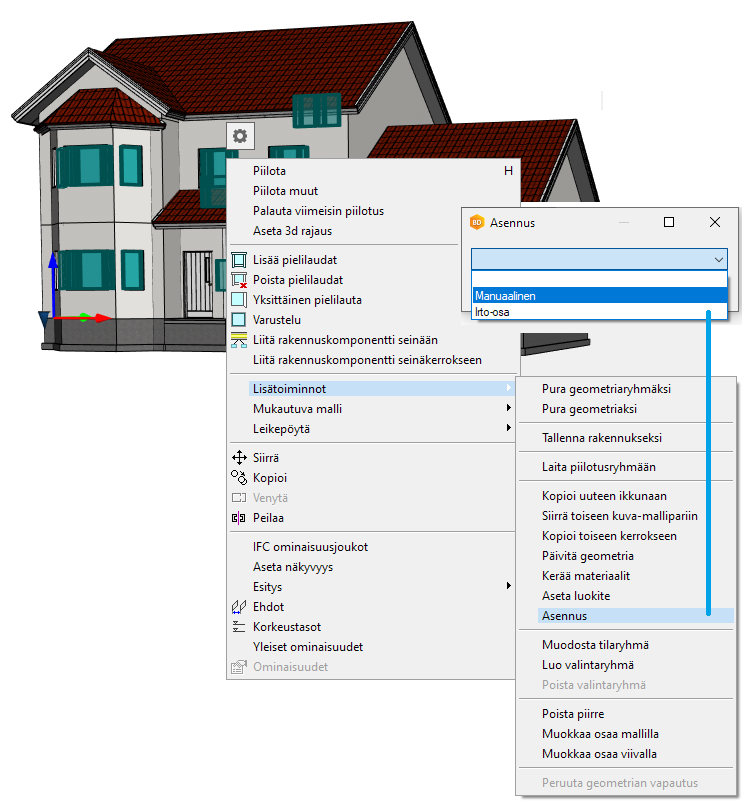 Rakennusosille, kuten ikkunat ja ovet voi nyt määritellä asennustietouden. Tietoa voi hyödyntää materiaaliraporteissa.
