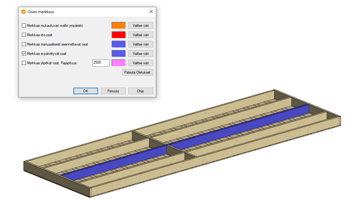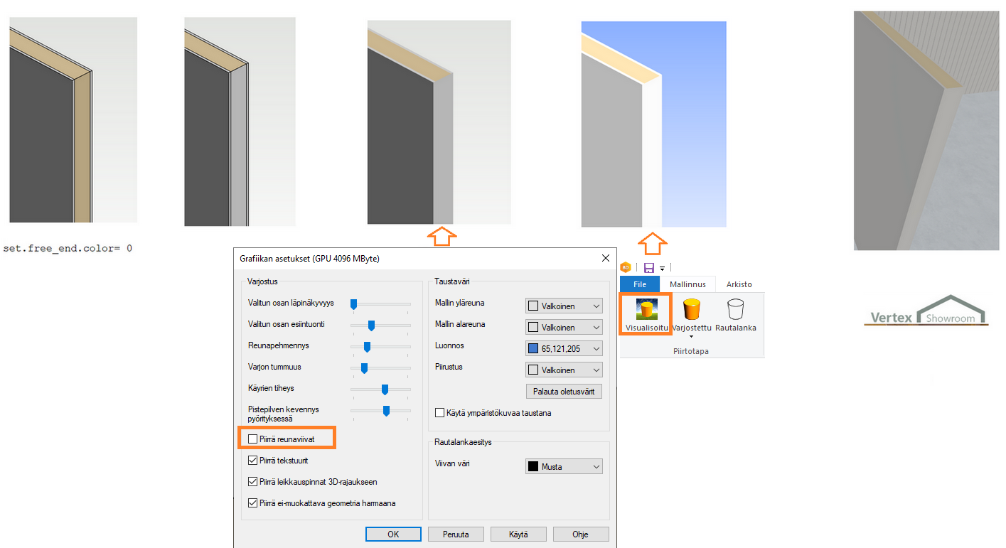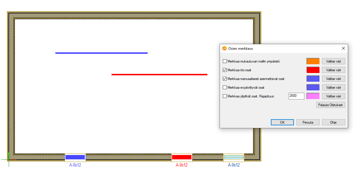 Jos seinässä on vapaa pääty (Arvo, voidaan asettaa PARAMETER tiedostoon tai seinän ominaisuuksiin), vapaiden päätypintojen väri asetetaan samanväriseksi kuin seinän sisäpinta.