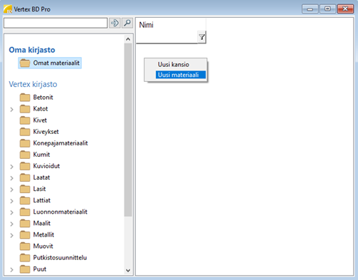 Tämän jälkeen hiiren oikean painikkeen takaa löytyy toiminto Uusi materiaali.
