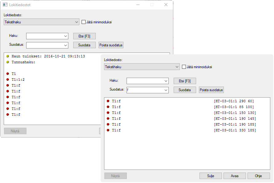 Lokitiedostoa voi lyhentää ja kohdistaa suodatustoiminnolla. Suodatuksen voi toistaa uudella merkkijonolla, jolloin suodatus tapahtuu jo suodatetuista riveistä. Suodatus-toiminto on kirjainkoosta riippumaton.