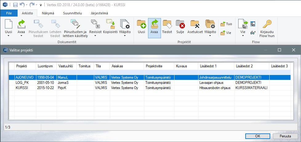 Projektin avaus tietokantanäkymän kautta