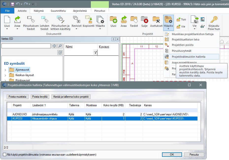 Käyttäjä voi nyt hallita projektin välimuistia erillisen valikon kautta.