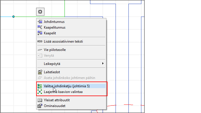 Lisäksi yhden johtimen tai symbolin valintaa saa laajennettua kytkentää seuraten koko kiinnostavan kaaviosivun osuuden kattavaksi.