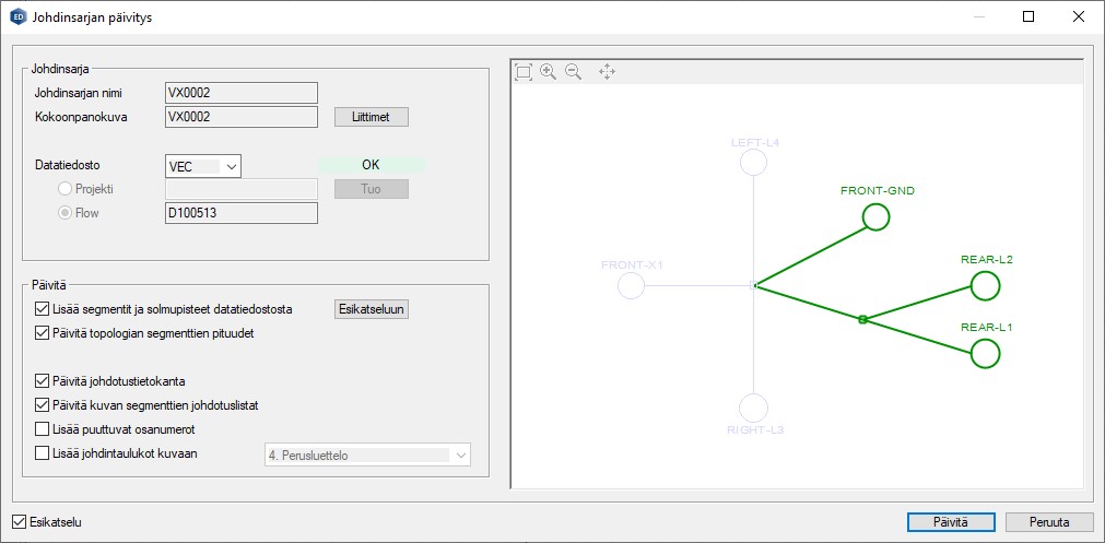 3D-johdinsarjan päivitys toimintoa "Lisää segmentit ja solmupisteet datatiedostosta" on automatisoitu. Ajamalla toiminto ohjelma lisää johdinsarjaan automaattisesti uudet haarakappaleet, uudet haarat ja liitinsymbolit sekä poistaa virheelliset reitit liitinsymbolien väliltä. Lopputulosta voidaan tarkastella päivitysdialogissa painamalla Esikatseluun-painiketta, jolloin ohjelma ajaa topologian päivityksen väliaikaseen kuvaan, joka näytetään esikatseluikkunassa muutokset korostaen. Varsinaiseen kuvaan päivitysajetaan, kun dialogissa toiminto on valittu ja painetaan Päivitä-painiketta.