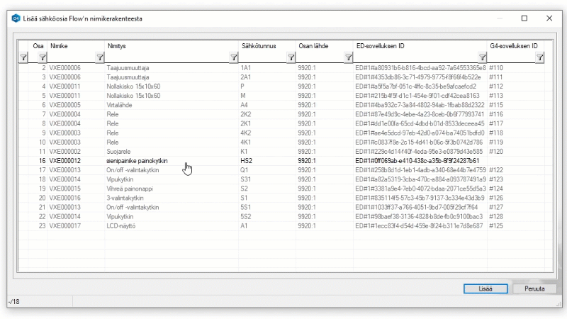 G4:n sähkötoimintojen Ribbon-välilehdelle (Johdinsarja) on lisätty Lisää rakenteesta -toiminto. Toiminto on aktiivinen, kun G4:ssä on 3D-sähkösuunnittelu-optio ja avattu kokoonpano on Flow-malli. Toiminto näyttää kaikki Flow-nimikerakeenteesta löytyvät ED:llä lisätyt sähköosat. Listalta voidaan lisätä osia malliin. Kun osa on lisätty malliin, näkyy sitä vastaava nimikerakenteen osa harmaana.