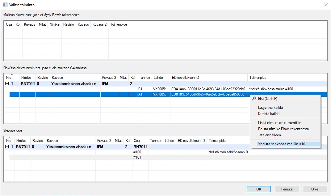 Yhdistäminen siirtää Flow-nimikerakeessa G4-mallin tiedot mm. mallin ID:n (#<numero>) nimikerakenteen sähköosalle ja vähentää osien määrää yhdelle. Ilman 3D-sähkösuunnitteluoptiota vertailu dialogissa ei ole muutoksia.