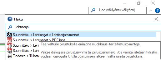 Haku kohdistuu kaikkiin toimintoihin, jotka ovat käytettävissä kyseisessä tilassa. Huomaa, että sama toiminto voi löytyä useastakin paikasta. Suurin osa toiminnoista on sekä tilannekohtaisessa valikossa, että työkalunauhassa.