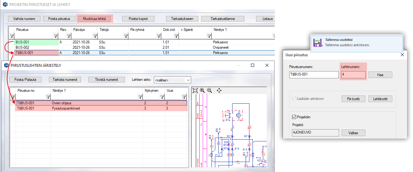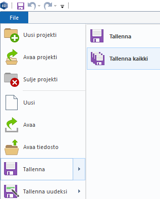 Uusi Toiminto: Tiedosto→Tallenna→Tallenna kaikki. Toiminto tallentaa kaikki muuttuneet avoimet kuvat. Ohjelma pyytää käyttäjältä tietoja, jos tallennus sitä vaatii: esim. viher- ja punakynäpiirustukset, symbolieditori ja piirustukset, joille ei ole määritetty vielä tiedostoa (uudet arkistoimattomat).